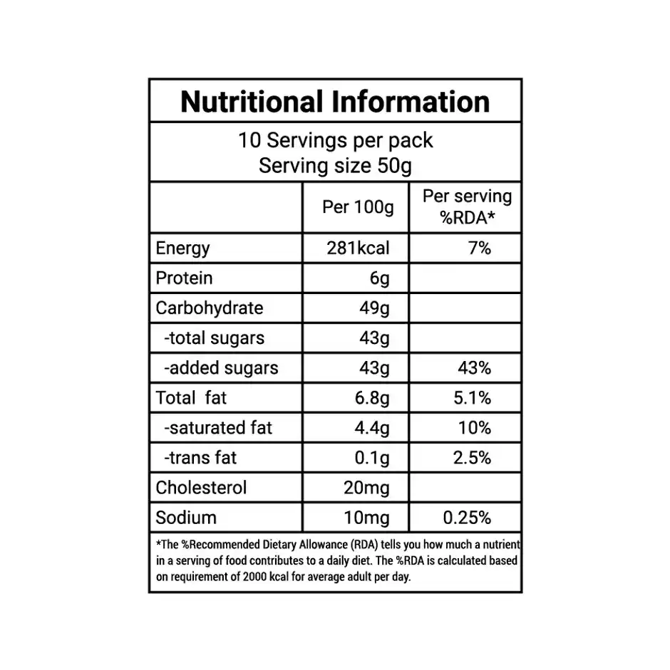 Energy (kcal) 281.0 (RDA 7%), Protein (g) 6.0, Carbohydrate (g) 49.0, Total fat (g) 6.8 (RDA 5.1%), Cholesterol (mg) 20.0, Sodium (mg) 10.0 (RDA 0.25%)