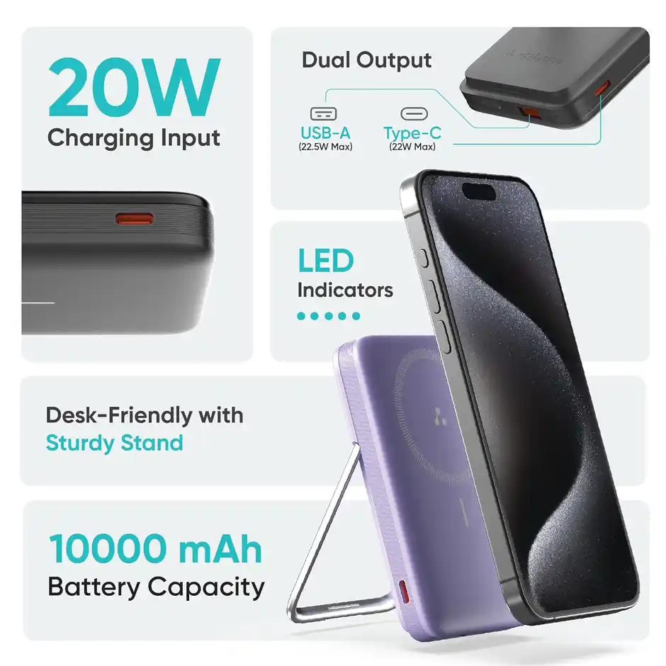 Ambrane 10000 mAh Magsafe Fast Wireless Power Bank for All Qi Enabled Devices (Pb11, Purple)