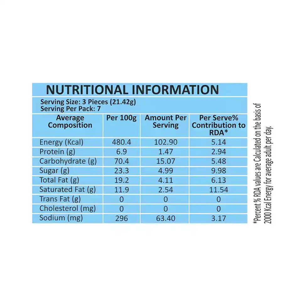 Carbohydrates (g) 74.8, Sugars (g) 23.4, Protein (g) 6.4, Total Fat (g) 17.3, Total Saturated Fatty Acids (g) 9.5, Total Trans Fatty Acids (g) 0.0, Energy (kcal) 432.2