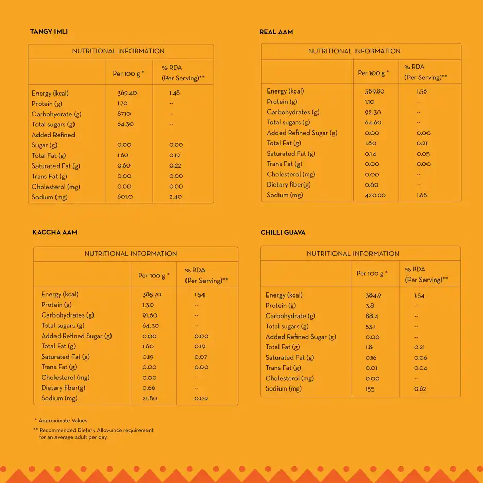 Tangy Imli: Energy (kcal) 369.4, Protein (g) 1.7, Carbohydrates (g) 87.0 || Real Aam: Energy (kcal) 389.8, Protein (g) 1.1, Carbohydrates (g) 92.3 || Kaacha Aam: Energy (kcal) 385.7, Protein (g) 1.3, Carbohydrates (g) 91.6 || Chilli Guava: Energy (kcal) 384.9, Protein (g) 3.8, Carbohydrates (g) 88.4