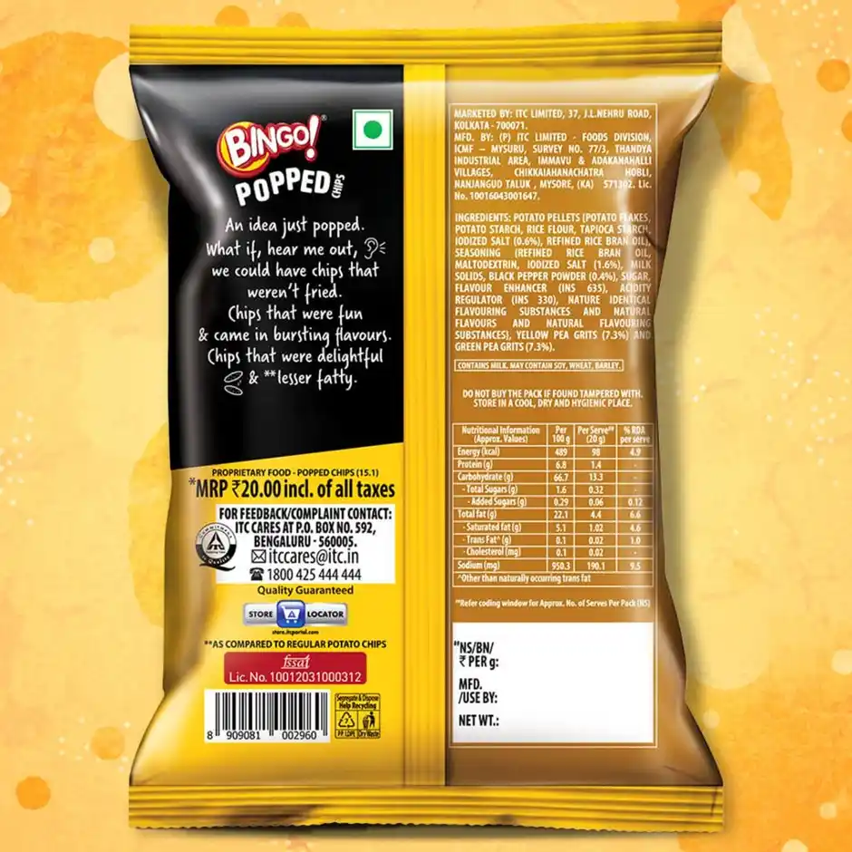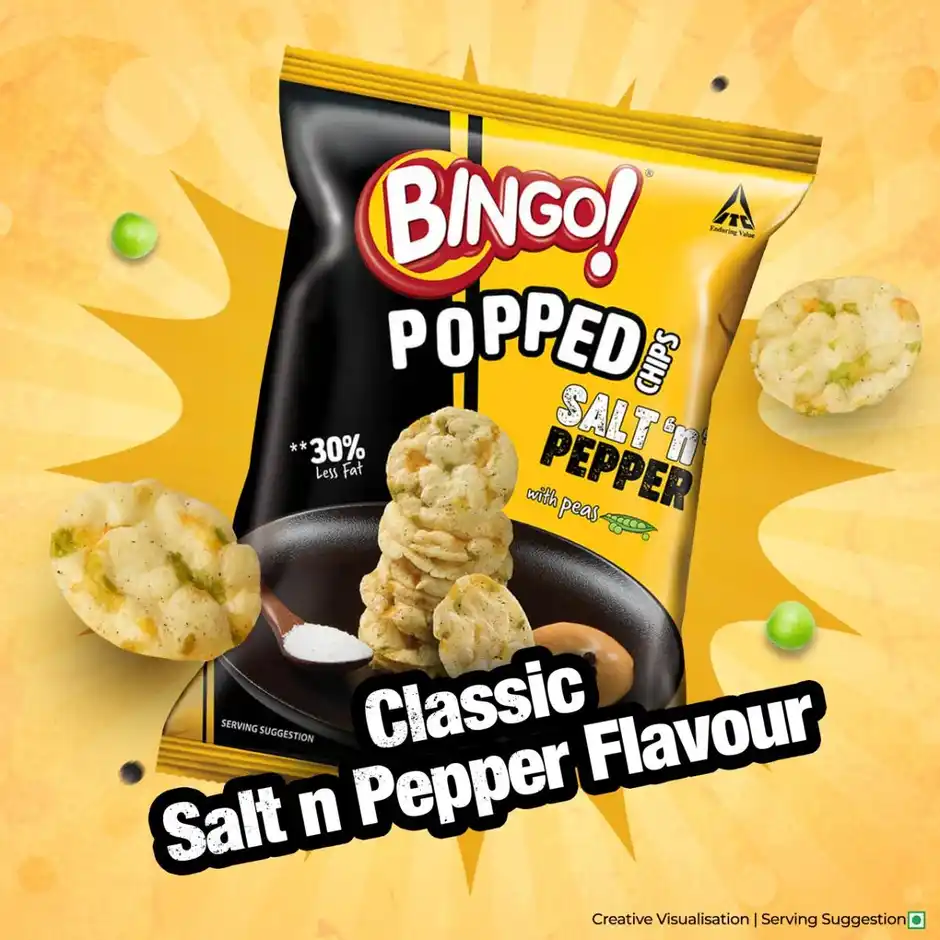 Bingo popped chipsdefying snacking gravity, these aren’t your regular earth-bound chips- they’re popped into existence using space-age technology for an otherworldly crunch, next-gen snacking made with premium potatoes and pea power, these chipsaren’t fried or baked – they’re popped to perfection for a melt-in-mouth experience that’s 30% less fatty, classic with a cosmic twist salt meets pepper in a flavor collision that’s anything but basic. this dynamic duo brings a perfectly balanced zing that’ll make your taste buds feel like they’re dancing in zero gravity, airy texture revolution remember when chipswere just chips these popped wonders are so airy, they might need their own gravitational field, perfect for those I could eat these forever’ moments, the perfect snack upgrade whether you’re binge-watching your way through the multiverse or need a study break that doesn’t weigh you down, Bingo popped chipsare your portal to elevated snacking, new addition to the snacks world breaking the boundaries of snack innovation, we’re introducing a whole new universe of crunch where ordinary meets extraordinary