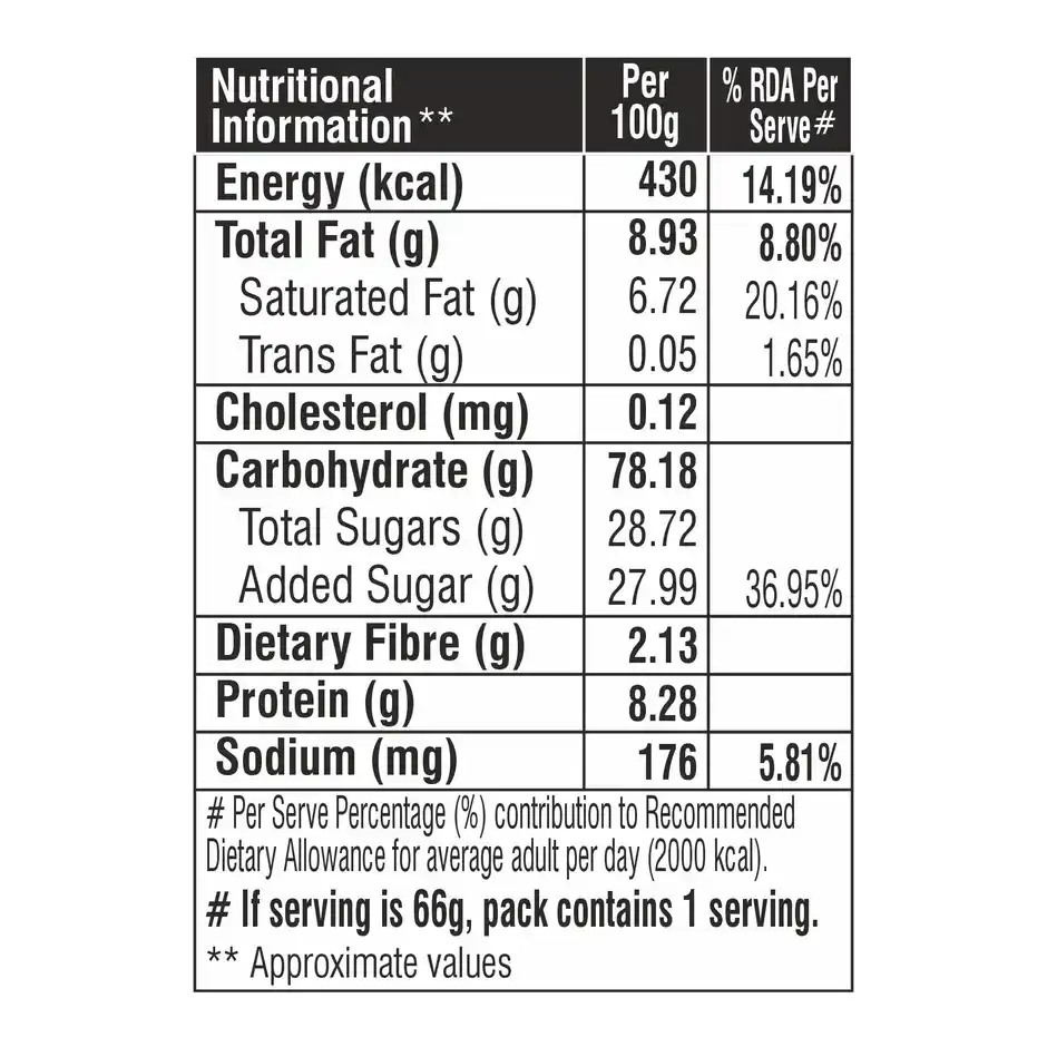 Energy (kcal) 430.0 (RDA 14.19%), Total Fat (g) 8.9 (RDA 8.8%), Saturated Fat (g) 6.7 (RDA 20.16%), Trans Fat (g) 0.1 (RDA 1.65%), Cholesterol (mg) 0.1, Carbohydrate (g) 78.2, Total Sugars (g) 28.7, Added Sugar (g) 28.0 (RDA 36.95%), Dietary Fibre (g) 2.1, Protein (g) 8.3, Sodium (mg) 176.0 (RDA 5.81%)