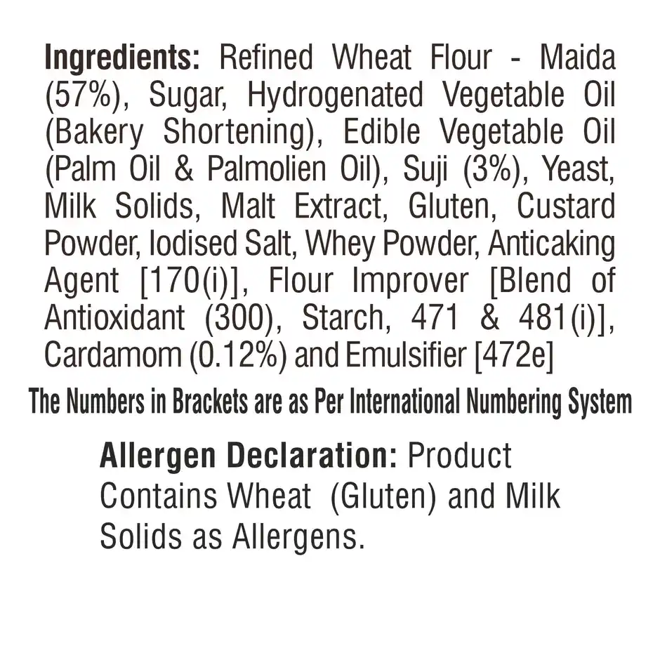 Refined Wheat Flour, Sugar, Hydrogenated Vegetable Oil, Edible Vegetable Oil, Suji, Yeast, Milk Solids, Malt Extract, Gluten, Custard Powder, Iodised Salt, Whey Powder, Anticaking Agent, Flour Improver, Cardamom