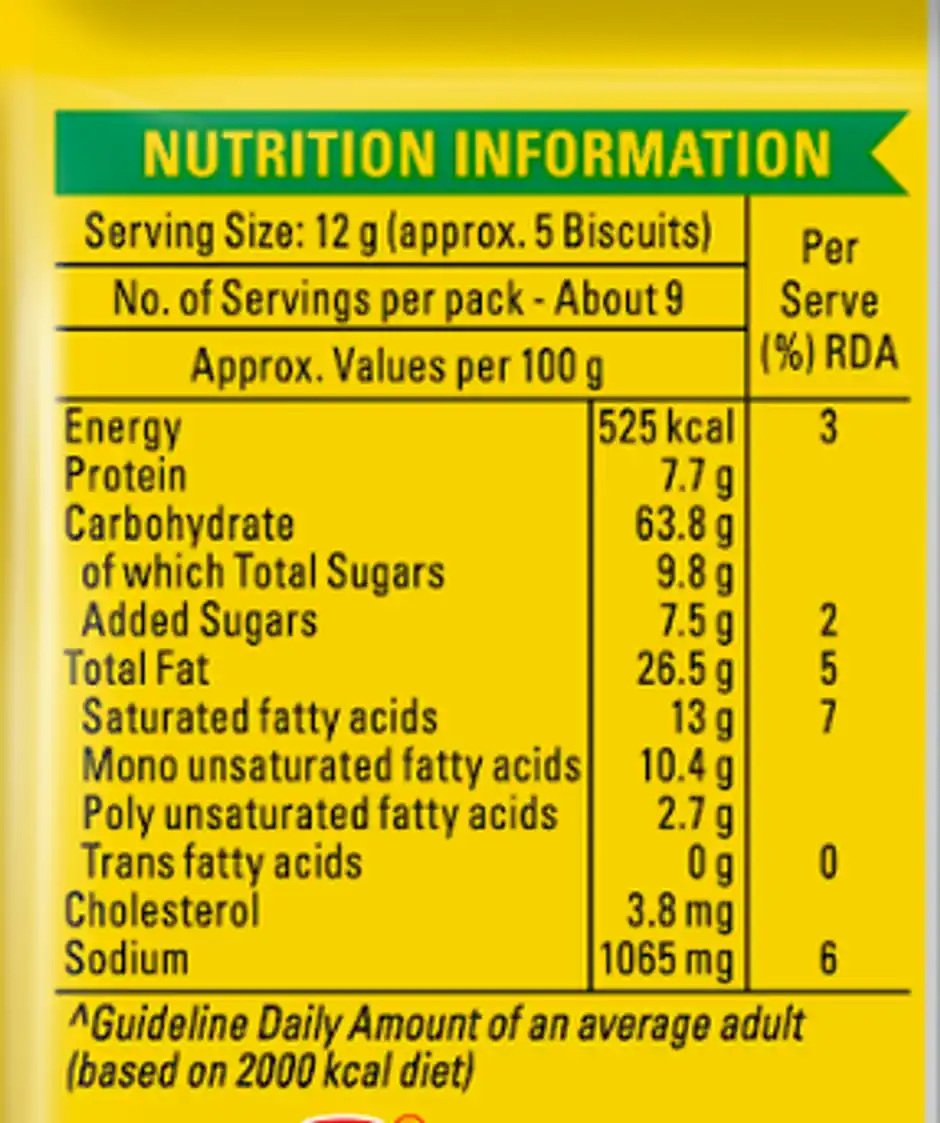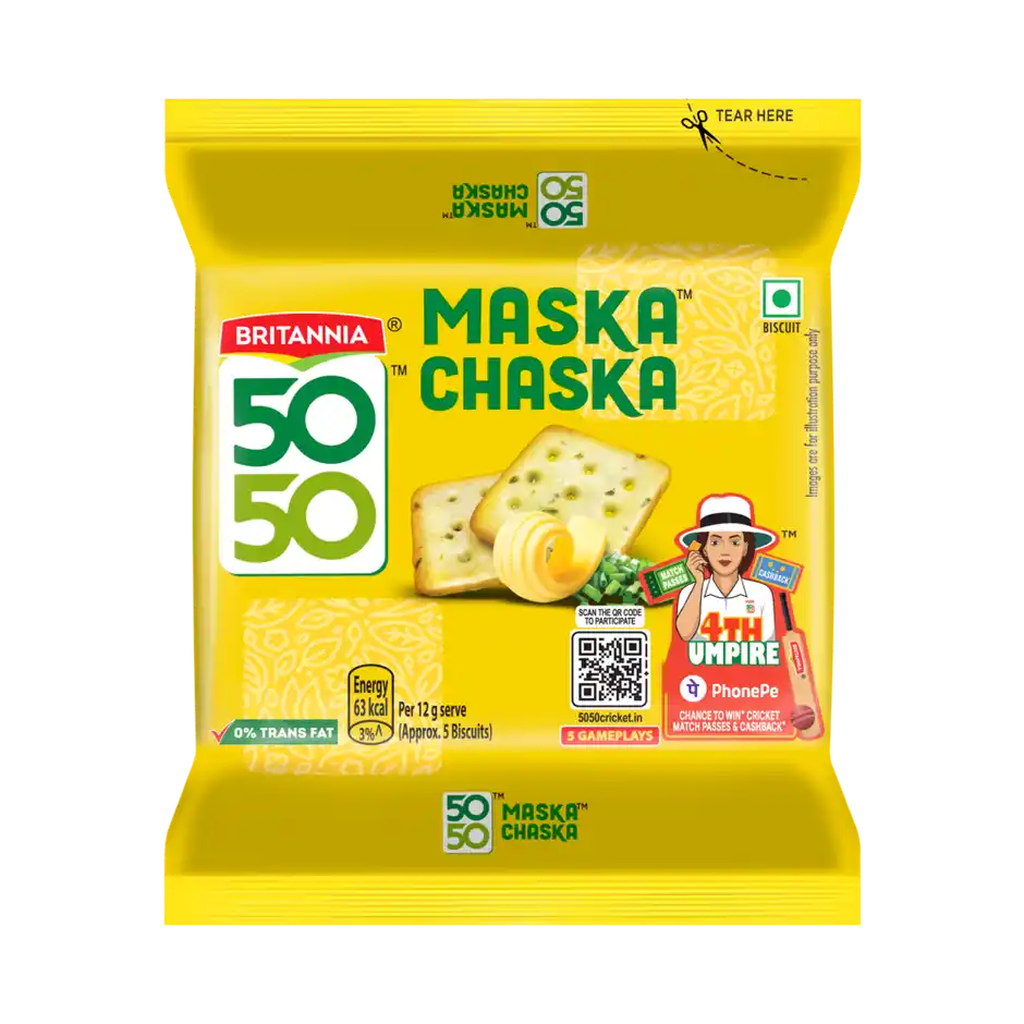 Britannia 5050 Maska Chaska Biscuit Share.svg Net Qty: 1 pack (100 g or 114.1g)