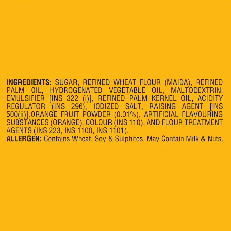 Refined Wheat Flour (Maida), Sugar, Refined Palm Oil, Refined Palm Olein Oil, Maltodextrin, Milk Solids, Starch, Orange Fruit Powder (0.4%), Emulsifier (322), Iodized Salt, Acidity Regulator (330), Raising Agent (500 (Ii)), Improvers (1100 (Vi), 1101 (I)), Dough Conditioner (223)
