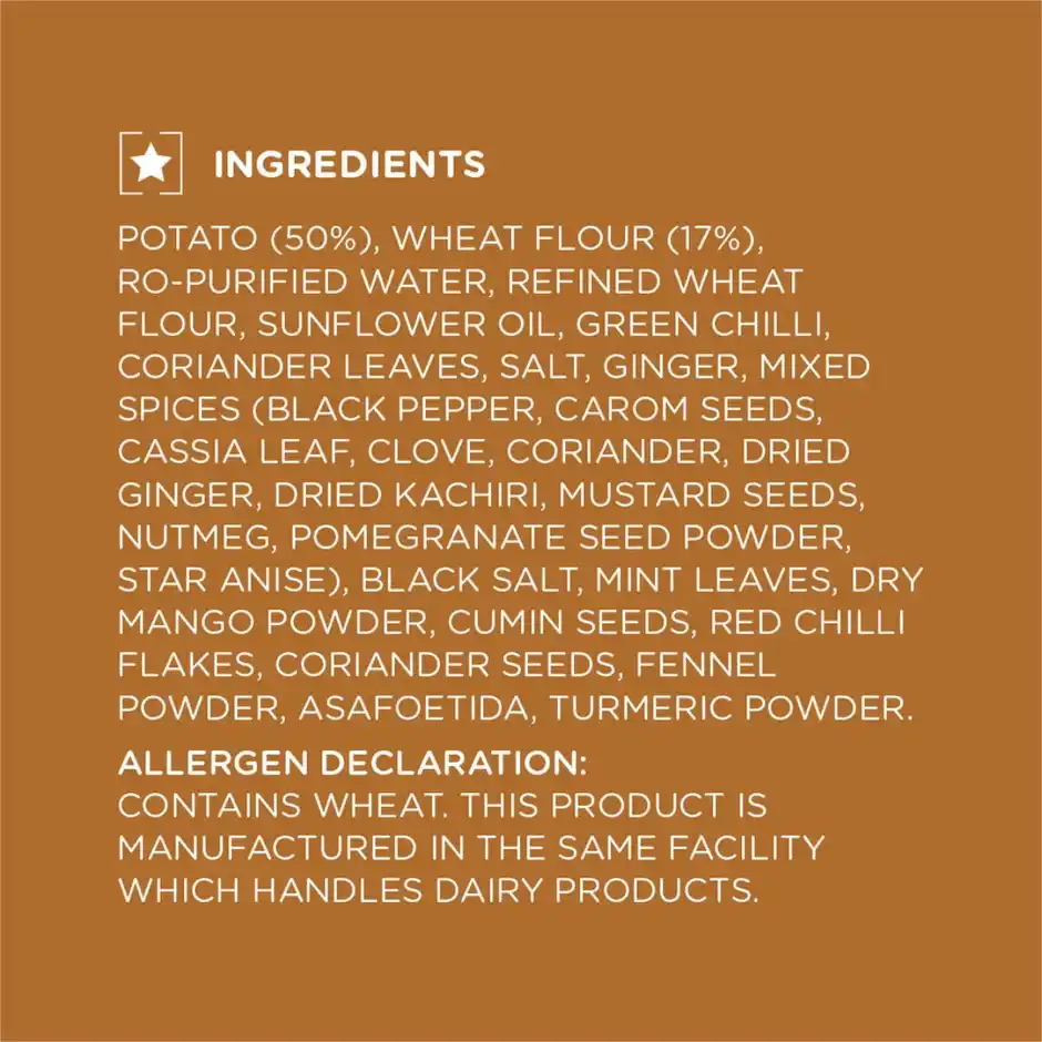 Potato (50%), Wheat Flour (17%), RO-purified Water, Refined Wheat Flour, Sunflower Oil, Green Chilli, Coriander Leaves, Salt, Ginger, Mixed Spices (Black Pepper, Carom Seeds, Cassia Leaf, Clove, Coriander, Dried Ginger, Kachiri, Mustard Seeds, Nutmeg, Pomegranate Seed Powder, Star Anise), Black Salt, Mint Leaves, Dry Mango Powder, Cumin Seeds, Red Chilli Flakes, Coriander Seeds, Fennel Powder, Asafoetida, Turmeric Powder