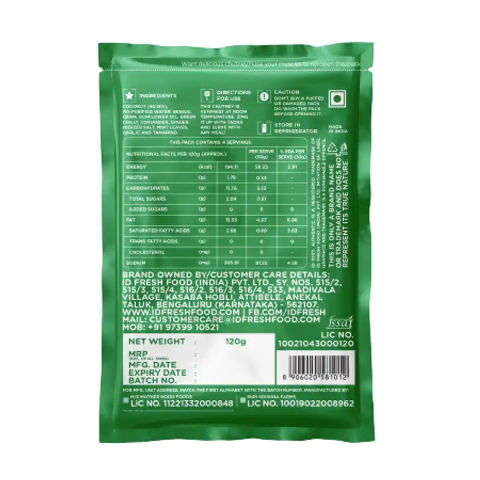 Coconut (40.18%), Ro Purified Water, Bengal Gram, Sunflower Oil, Green Chilly, Coriander, Ginger, Iodized Salt, Mint Leaves, Garlic and Tamarind