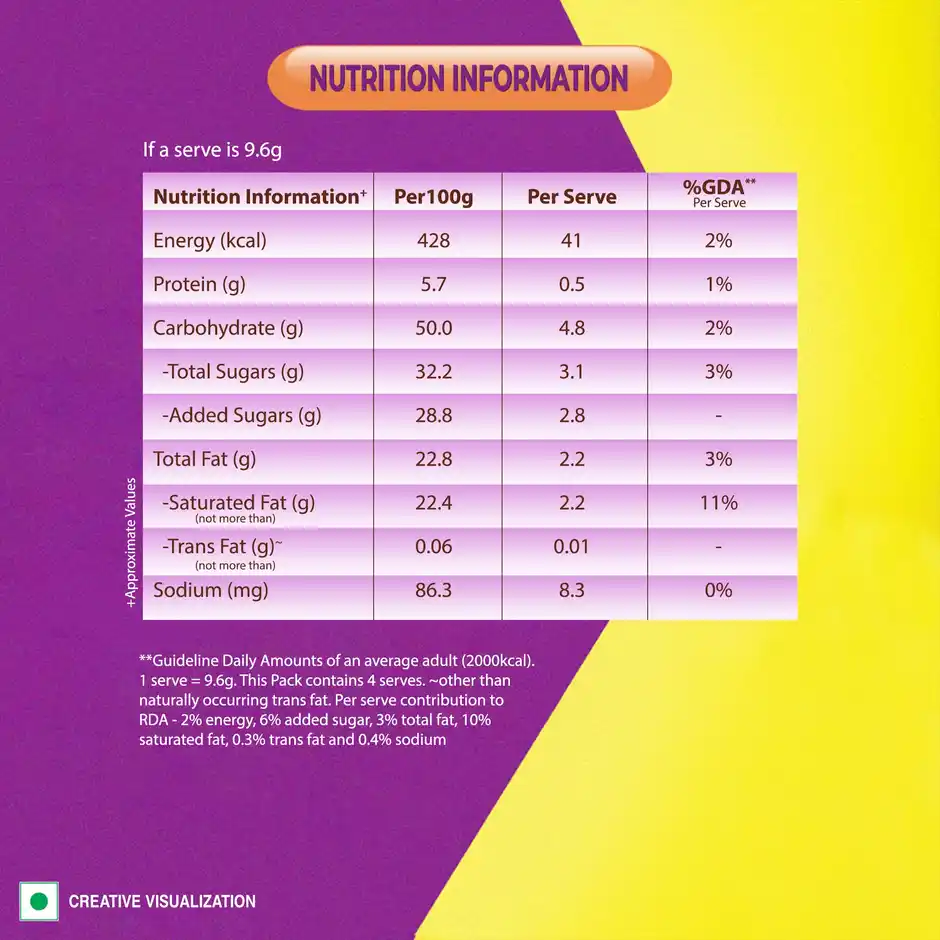 Energy (kcal) 428.0 (RDA 2%), Protein (g) 5.7 (RDA 1%), Carbohydrate (g) 50.0 (RDA 2%), Total Sugars (g) 32.2 (RDA 3%), Total Fat (g) 22.8 (RDA 3%), Saturated Fat (g) 22.4 (RDA 11%), Sodium (mg) 86.3 (RDA 0%)