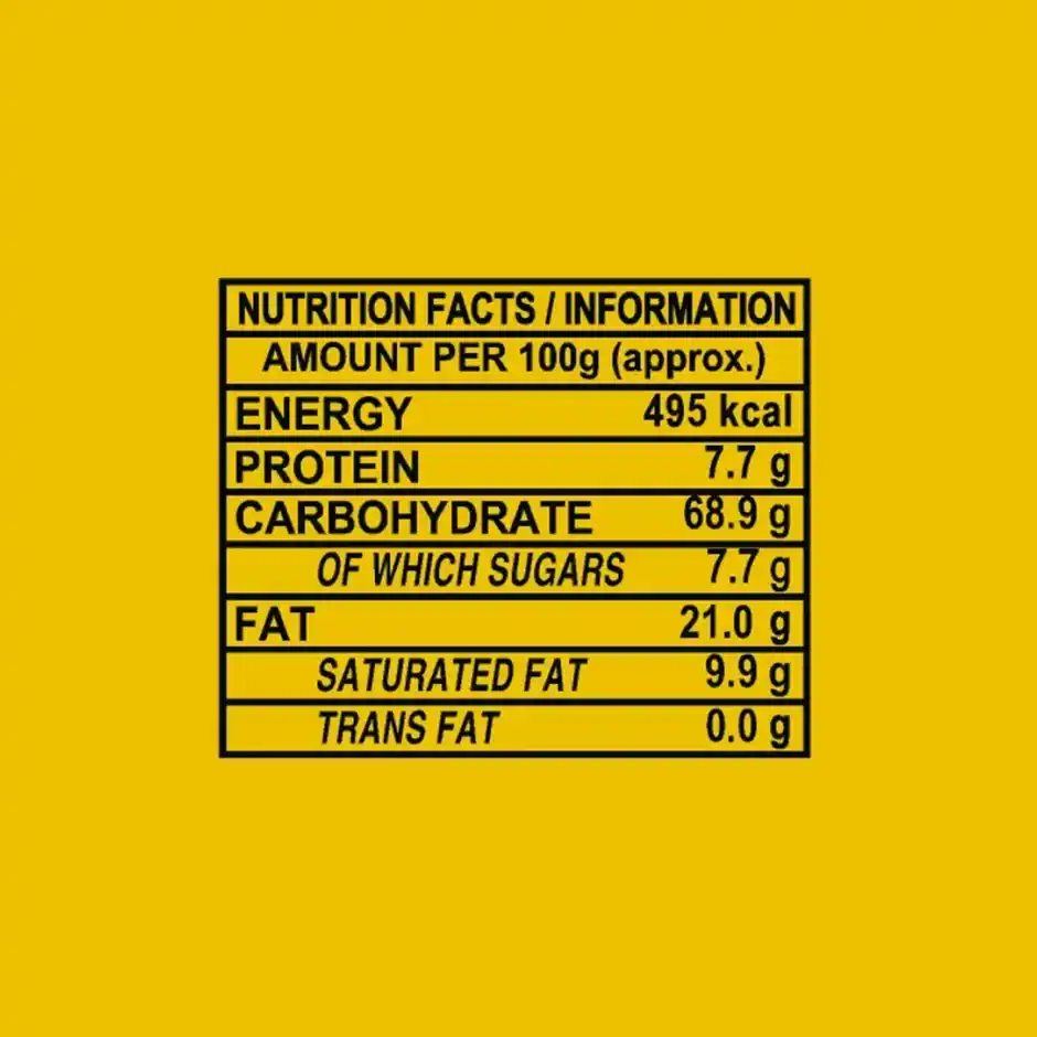 Energy (kcal) 495.0, Protein (g) 7.7, Carbohydrate (g) 68.9, Sugars (g) 7.7, Fat (g) 21.0, Saturated Fat (g) 9.9, Trans Fat (g) 0.0