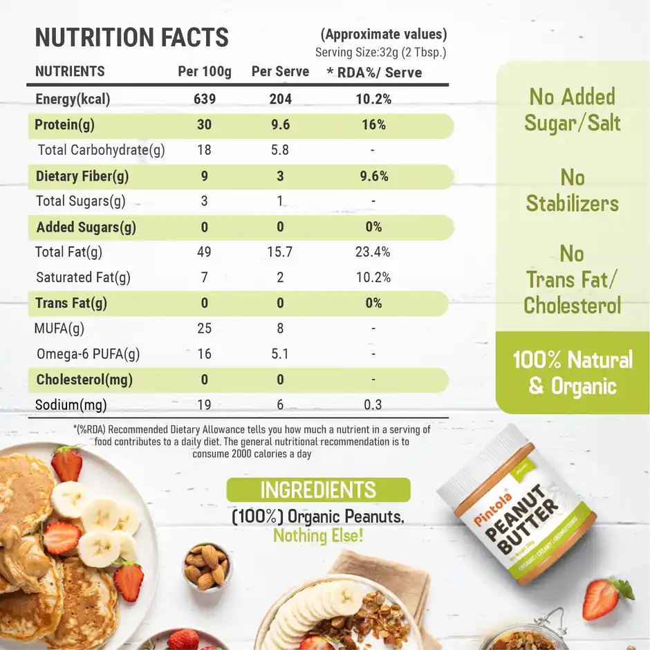 Pintola Organic Unsweetened Peanut Butter Creamy – High Protein 30G & 9G Dietary Fiber (350g)